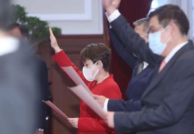 20日,臺灣新任駐美代表蕭美琴宣誓就職。穿著一身大紅外套,她顯得頗有些喜氣洋洋。